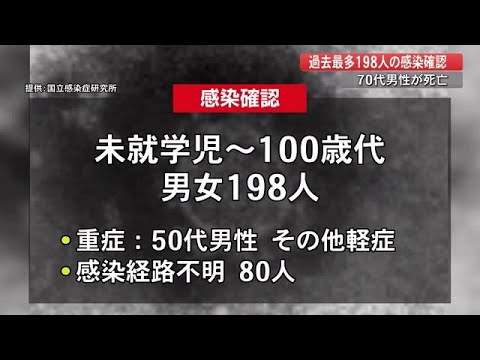 感染が確認されたのは、未就学児から100歳代までの男女198人です。50代の男性が重症で、感染経路不明の人は80人です。
