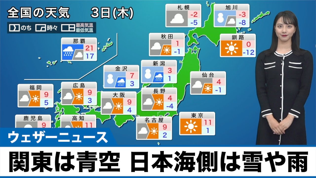 冬型の気圧配置が続きます。北日本の日本海側や北陸は雪の降りやすい天気です。関東は晴れますが、西日本ではスッキリしない空になります。