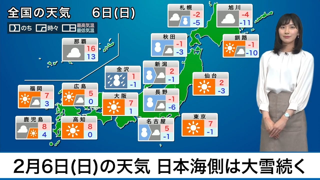 6日(日)も日本付近は冬型の気圧配置が続き、上空には強い寒気が居座ります。