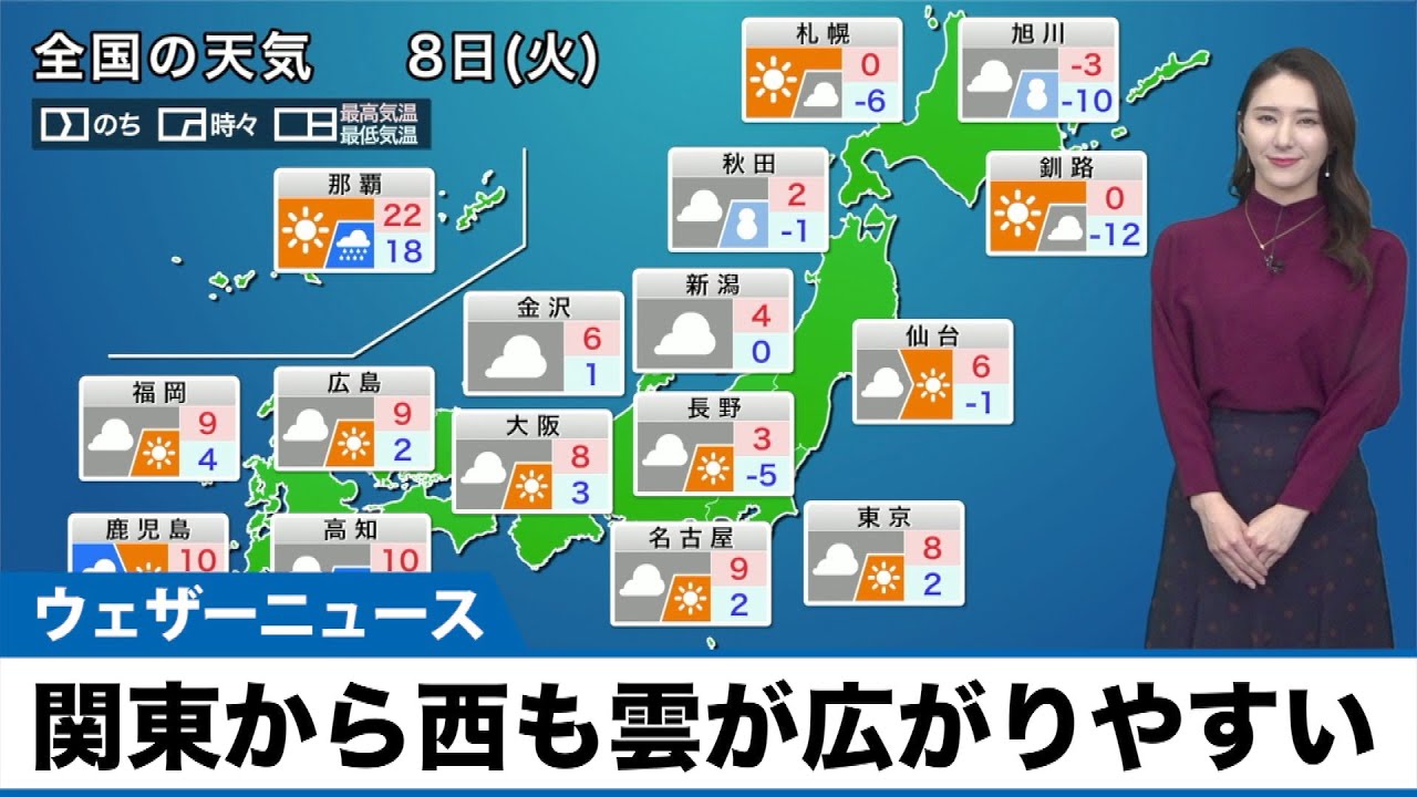 弱い冬型の気圧配置で、北日本や東日本の日本海側は雪や雨が降りやすく、北陸では雷を伴って強く降るおそれがあります。関東から西の太平洋側は雲が広がりやすくスッキリしない空です。