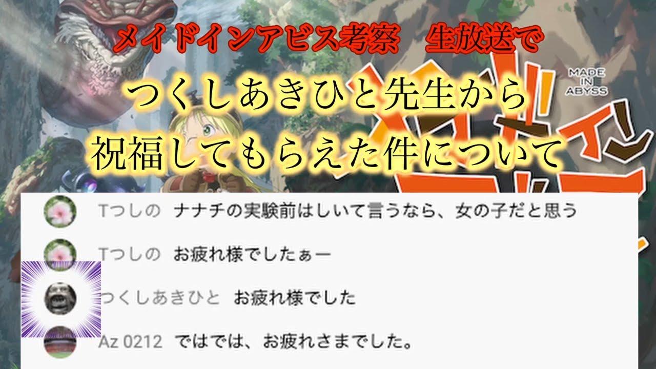2022年2月22日午後10時から2月23日午前4時近くまでやっていたメイドインアビスを考察する生放送の終了間際に、つくしあきひと先生から祝福のコメントをいただきました。