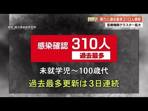 感染が確認されたのは未就学児から100歳代までの男女310人です。過去最多を更新するのは3日連続となりました。90代と60代の女性2人が重症、70代の女性と50代の男性2人が中等症で、その他は軽症です。