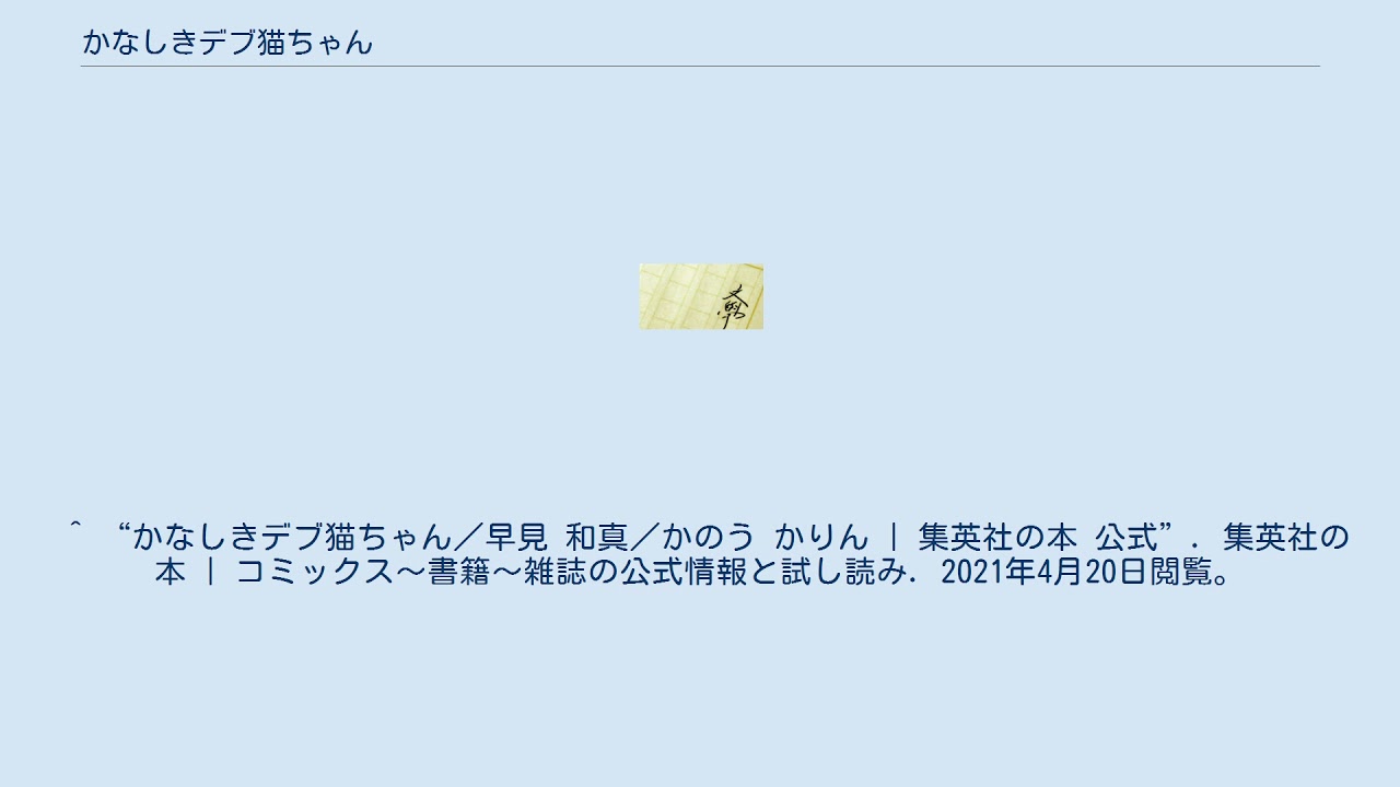 ^ “かなしきデブ猫ちゃん/早見 和真/かのう かりん | 集英社の本 公式”. 集英社の本 | コミックス~書籍~雑誌の公式情報と試し読み. 2021年4月20日閲覧。