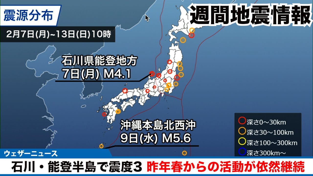 東北南部から東海にかけての東日本を中心に地震が多く、9日(水)頃は沖縄本島の北西沖で地震が多発しました。この期間に震度3以上の地震は1回発生しています。(2月7日~13日10時の集計)