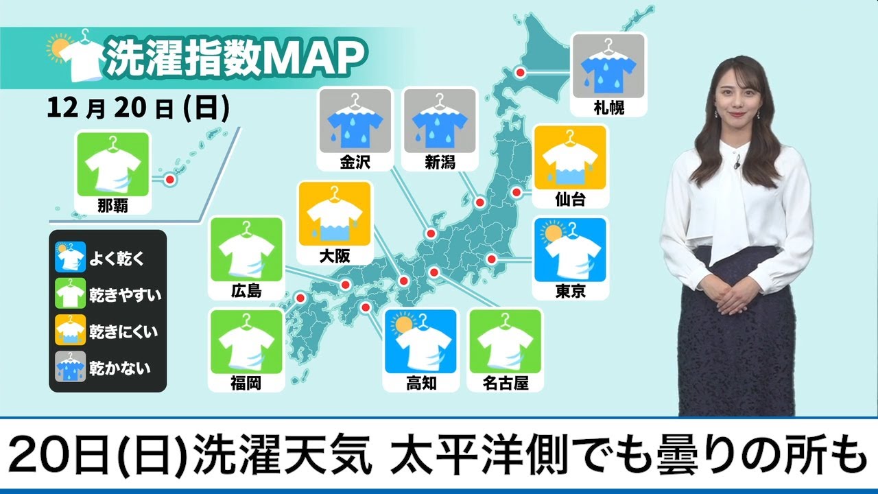 明日20日(日)も冬型の気圧配置が続き、上空の寒気が居座ります。日本海側のエリアでは雨や雪が降りやすく洗濯物の外干しには適さない天気となりそうです。 太平洋側も、東海や近畿、北日本では雲が多く日差しが届きにくいなりそうです。 2020Casterウェザーニュースキャスターゲリラ豪雨ゲリラ雷雨ニュース予報北日本台風台風情報地震大雨天気天気予報情報東日本気象気象予報士減災西日本防災