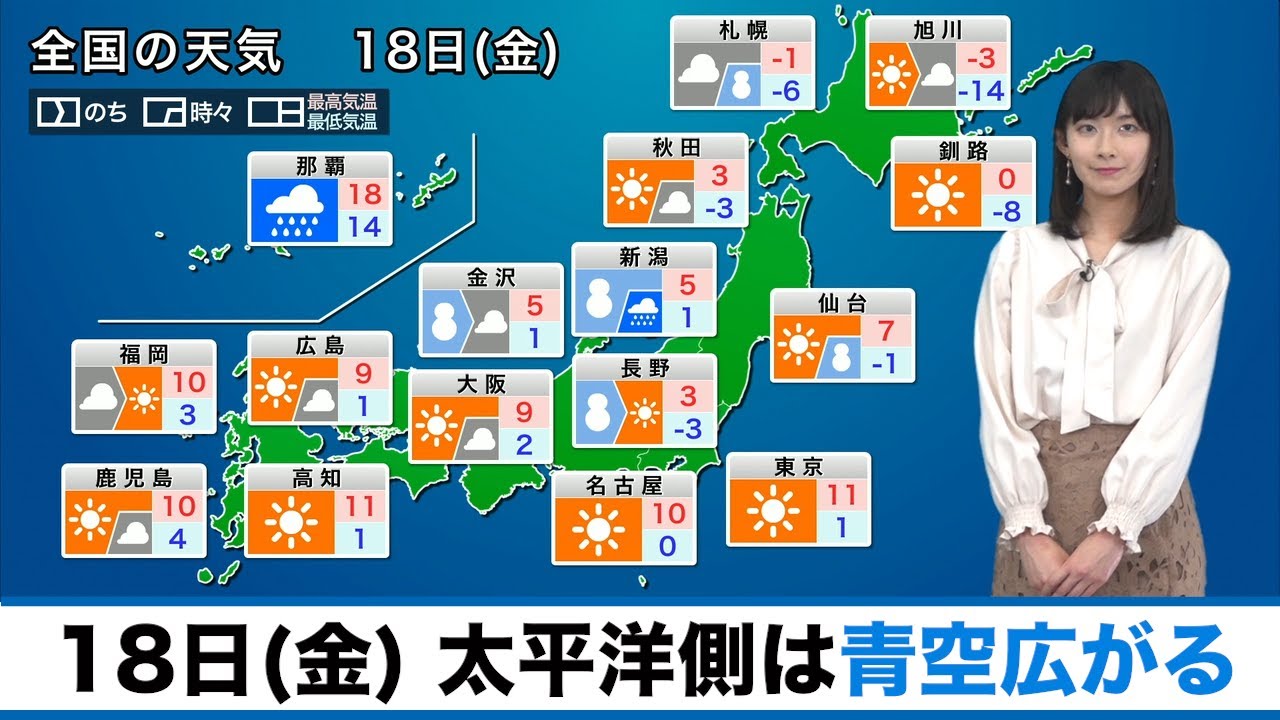 18日(金)は、日本付近の冬型の気圧配置は次第に緩みます。太平洋側では日差しの届く所が多い見込みです。日本海側は雪が降りますが、西から天気は回復に向かいます。