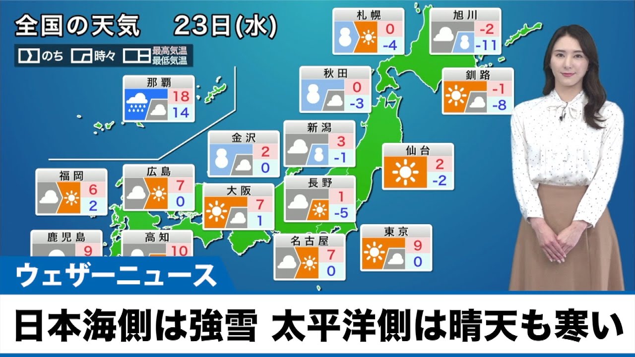 冬型の気圧配置で、日本海側は雪の降りやすい状態が続きます。強まる雪や吹雪に警戒が必要です。太平洋側は晴れるところが多いものの、冬のような寒さでまだ防寒が欠かせません。