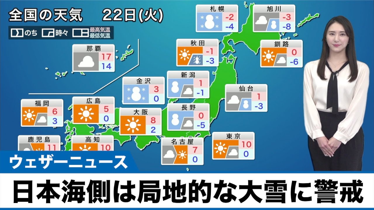 冬型の気圧配置が続きます。発達した低気圧が北海道から少し離れるため猛吹雪は少し落ち着くものの、局地的な大雪には警戒が必要です。太平洋側は乾燥した晴天の所が多くなります。