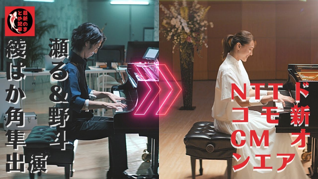 The commercial begins with Ayase playing the piano fluently, followed by Mino playing the piano with a sensor attached to her arm to acquire information such as muscle movements.
