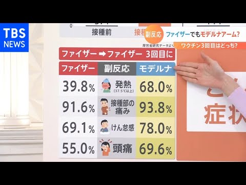 ワクチン3回目の接種が進む中、気になるのは副反応。モデルナとファイザーではどちらを選択するか迷う人もいるようですが、あるデータによると、「発熱」についてはモデルナの方が頻度が高いという結果もあります。一方で、接種を済ませた人の例ですが、3回ともファイザーのケースでも「モデルナアーム」のような副反応があったということもあるようです。今後本格化する、5~11歳の接種でも気になるのは副反応。今わかっていることについて専門家にききました。