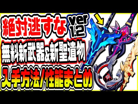 原神げんしんのver1.2で新たに登場する新武器や新聖遺物の入手方法や性能について公式情報をまとめながら解説しました。
