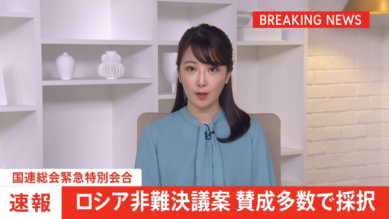 Share Facebook Twitter Pinterest LinkedIn ロシアのウクライナ侵攻を受け開かれた国連総会の緊急特別会合で、ロシアを非難し、ウクライナからの即時撤退を求める決議案が賛成多数で採択されました。 法的拘束力はないものの、国際社会のロシアに対する非難の意志表示となります。 (03日02:07) japanNEWSTBSTBSNEWSニュースロシア報道日本最新ニュース