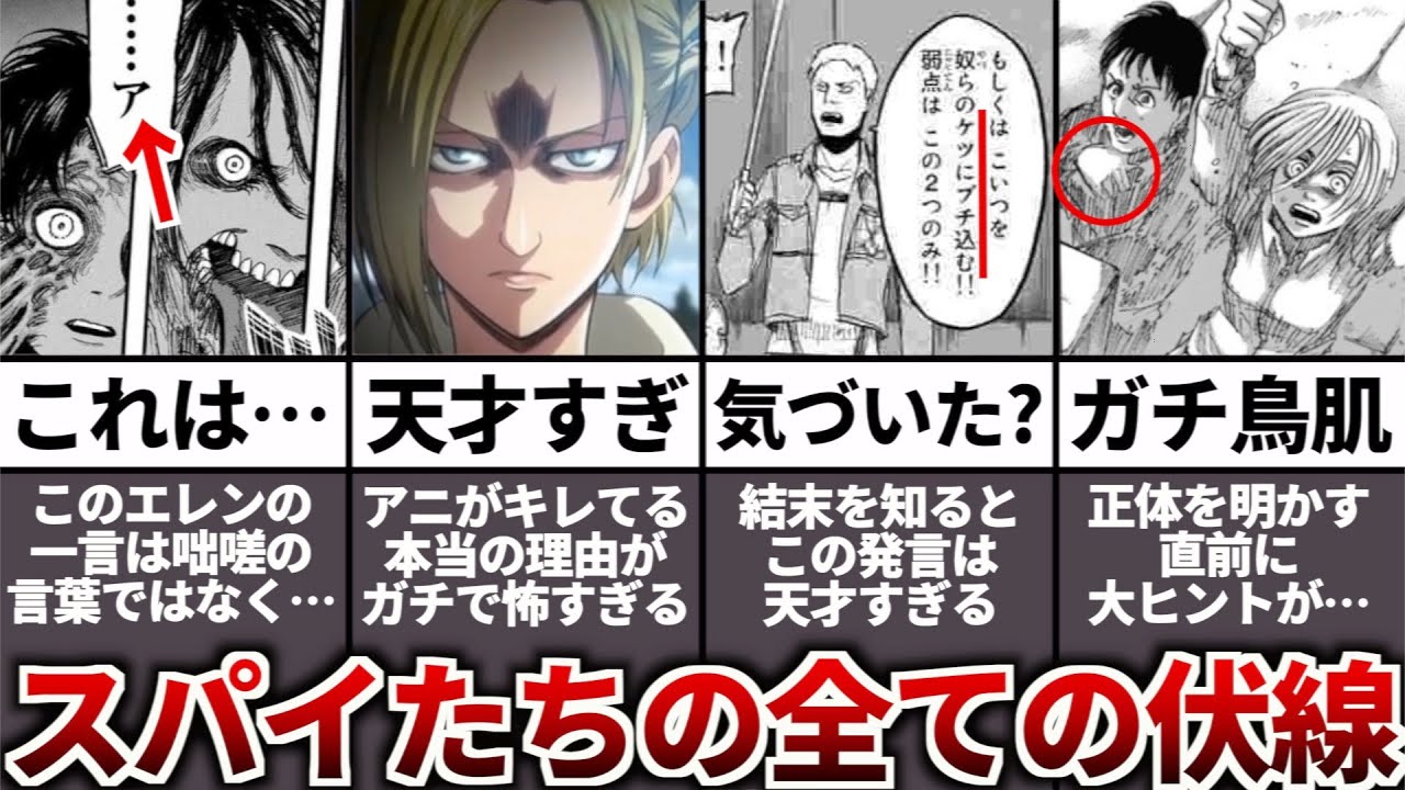 今回は、ライナー、アニ、ベルトルトの正体が巨人だとわかる全ての伏線を紹介していきました。 みなさんはどの伏線が好きですか? 参考資料&引用 ©諫山創・講談社/「進撃の巨人」The Final Season製作委員会 ※動画内で使用している全ての画像は上記の作品からの引用させていただいております。 #進撃の巨人 #ファイナルシーズン #The Final Season Part2 #考察 The Final Seasonエレンファイナルシーズンライナーリヴァイ巨人考察解説進撃の巨人進撃の巨人 The Final Season Part 2