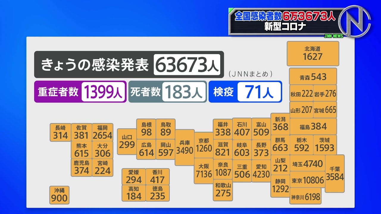 都道府県別の感染者で、東京に次いで多かったのは大阪で7136人、神奈川で6198人、埼玉で4740人の感染が発表されました。全国で入院している感染者のうち、重症者の数は1399人。新たな死者については、183人発表されています。