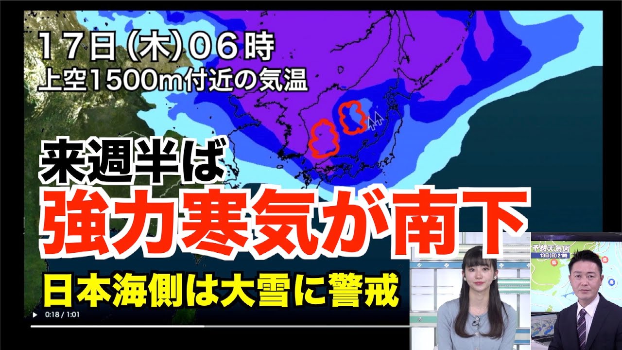 上空5000m付近には-39℃以下という非常に強い寒気が流れ込み、低気圧の周辺では大気の状態が不安定になります。雪雲が発達して、日本海側では断続的に雪が強まる見込みです。