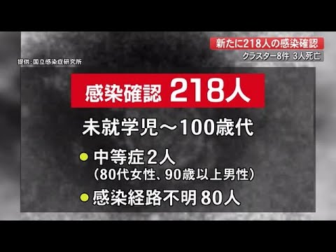 感染が確認されたのは未就学児から100歳代の男女218人です。80代女性と90歳以上の男性2人が中等症で、そのほかは軽症です。80人の感染経路が分かっていません。