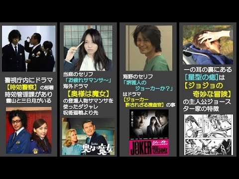 前作ケイゾク、ジョジョの奇妙な冒険、科捜研の女、853〜刑事・加茂申之介、警視庁捜査一課9係、警視庁失踪人捜査課高城賢吾、臨場、ゴンゾウ 伝説の刑事、スペシャリスト、TRICK、時効警察、相棒、熱海の捜査官、太陽にほえろ、AKB48、華麗なる一族、奥様は魔女、ひみつのアッコちゃん、ジョーカー許されざる捜査官、北斗の拳、ハロプロ、ルパン三世、カイジ、猫の恩返し、ハリー・ポッター、イワイライト、ゴースト〜ニュヨークの幻〜、魔法にかけられて、シュレック、オペラ座の怪人
