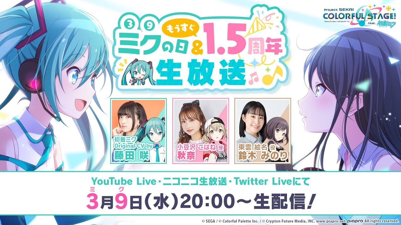 2022年3月9日(水)20時より「プロジェクトセカイ ミクの日&もうすぐ1.5周年生放送」を実施いたします。