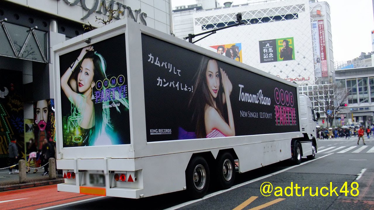 渋谷を走行する、板野友美 2014年12月17日発売 6枚目のシングル「COME PARTY!」(カム パーティー)のアドトレーラー。