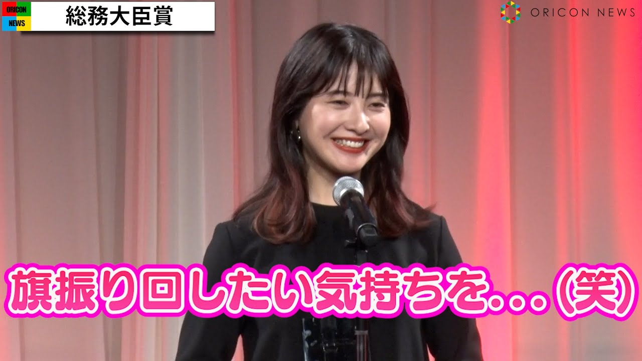 黒のロング丈のワンピースで登場した吉高は、総務大臣賞のフラッグ、モノリスを受け取ると「ああいう立派な旗を持って、このような音楽が流れたら強くなったような気がします(笑)。旗を振り回したい気持ちをグッとこらえて、コメントさせていただきます」とにっこり。