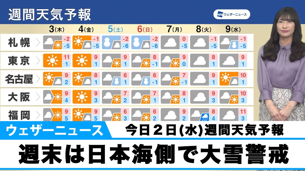 特に、週末の5日(土)〜6日(日)は日本の上空に強い寒気が流れ込み、日本海側では強い雪や大雪に警戒が必要です。この寒気は、今季では年末年始に次ぐ強さとなる見込みで、山陰でも大雪のおそれがあり、東海や近畿などでも雪が降る予想です。