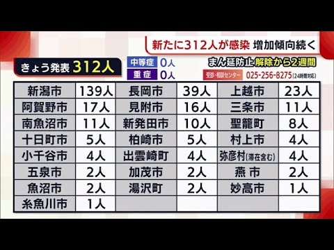 Share Facebook Twitter Pinterest LinkedIn 新潟県内では21日、新たに312人の新型コロナウイルス感染が発表されました。 まん延防止等重点措置が解除されてから21日で2週間。県内では感染者の増加が続いています。 県内で新たに感染が確認されたのは新潟市で139人、長岡市で39人、上越市で23人など合わせて312人です。重症や中等症の人はいませんでした。 まん延防止措置の解除から2週間。県内では新規感染者数の増加が続き、割合は10歳未満と10代が多くなっています。 県は改めて感染症対策の徹底を呼びかけています。 オミクロン株新型コロナウイルス新型コロナウイルス感染症新潟県