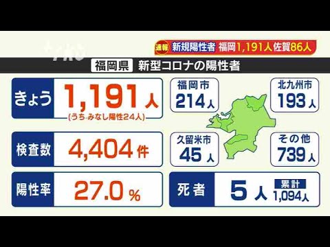 福岡県は21日、新型コロナウイルスの検査で新たに1191人の陽性を発表しました。