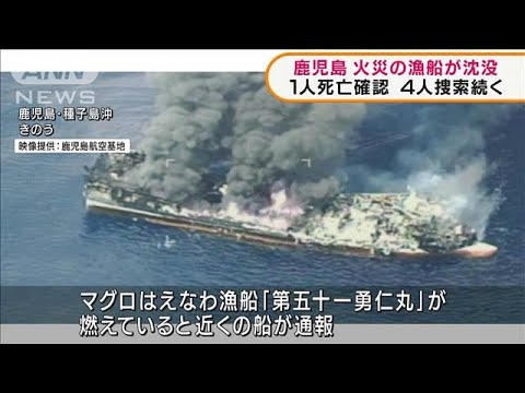 21日、鹿児島県種子島の南東の海上で火災が起きた漁船は夕方に沈没しました。救助された4人のうち1人が死亡し、残る4人の捜索が続いています。