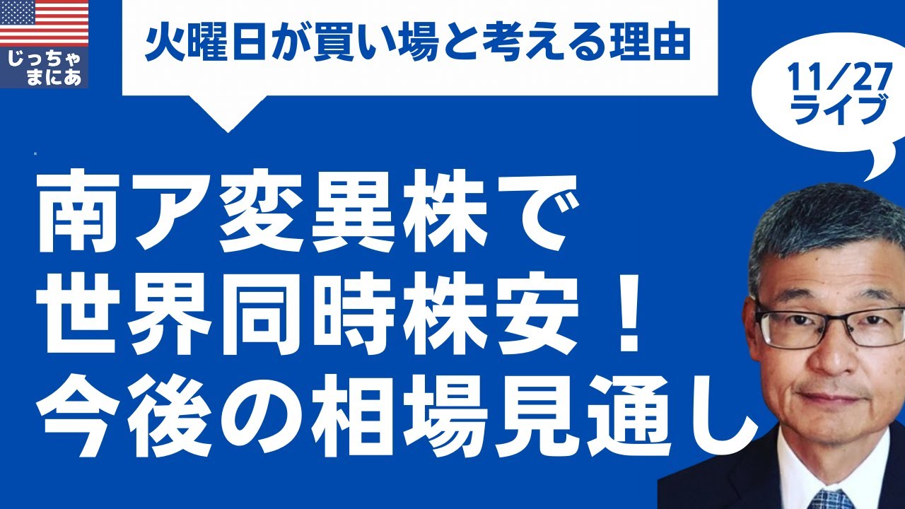 「じっちゃま」こと広瀬隆雄氏が南アで確認された新しい変異株の影響による世界同時株安の解説と、今後の相場見通しについて2021/11/27YouTubeライブで解説した内容をまとめました。じっちゃまは米国株について強気の見通しを示した上で、これまでの下落局面のある法則を当てはめれば火曜日が買い場になるかもしれないと解説します。