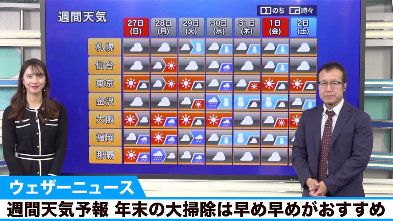 今年最後の日曜日となる27日(日)は冬型の気圧配置が弱まり、日本海側の雪は収まるため、除雪を行うチャンスとなりそうです。ここ数日で雪の多かった所では、屋根からの落雪の危険性がありますので、除雪作業を一人で行うことは避け、頭上をしっかりと注意した上で、進めるようにしてください。西日本から天気は下り坂となりますが、関東などは晴れ、大掃除日和となりそうです。 2020Casterウェザーニュースキャスターゲリラ豪雨ゲリラ雷雨ニュース予報北日本台風台風情報地震大雨天気天気予報情報東日本気象気象予報士減災西日本防災