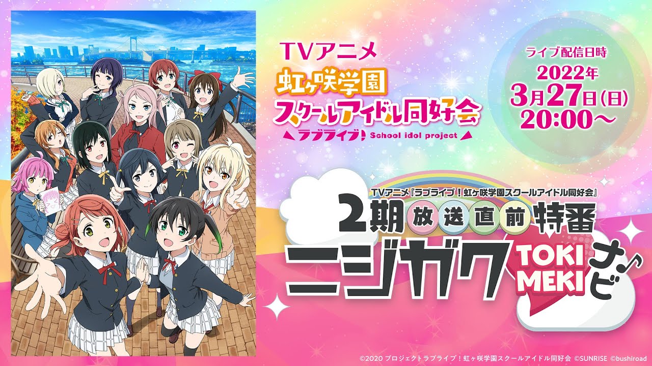 『ラブライブ!虹ヶ咲学園スクールアイドル同好会』TVアニメ2期放送直前特番ニジガクTOKIMEKI ナビ♪ ライブ配信日時:2022/3/27 20:00~ いよいよ4月より放送開始となる「ラブライブ!虹ヶ咲学園スクールアイドル同好会 TVアニメ2期」の放送直前特番をライブ配信いたします。公式サイトhttps://www.lovelive-anime.jp/nijigasaki/ 公式ハッシュタグ:#虹ヶ咲 LOVELIVEラブライブラブライブ!ラブライブ!虹ヶ咲学園スクールアイドル同好会 校内シャッフルフェスティバル虹ヶ咲虹ヶ咲学園虹ヶ咲学園スクールアイドル同好会
