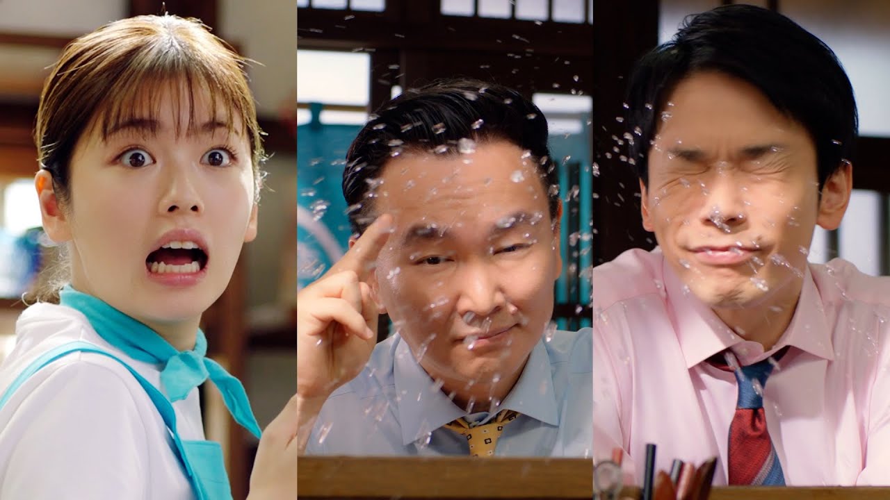 小芝が勢いよくやかんを桶に置いて水が跳ねるシーンでは、手前にビニールシートを張って実際に水を飛ばして撮影。山内は動じず決めポーズ、濱家もタイミングバッチリで驚きのリアクションを取るなど、さすがの演技力を見せてくれた。焦る演技の小芝に、親指を立てて「ナイスナイス〜」とキメ顔をしている山内には、横目に「ナイス?」とすかさず濱家のツッコミが入るなど、コンビらしさが垣間見える撮影現場となった。