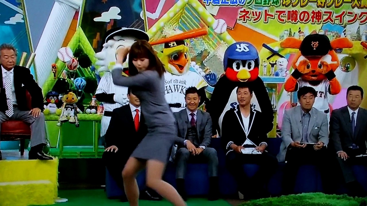稲村亜美がスーツで神スイングしてちょっとエッチで男性陣興奮!