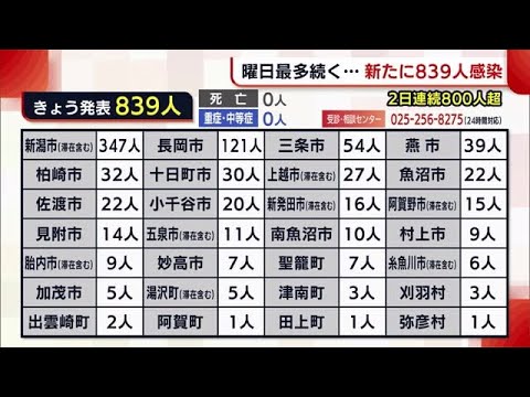 7日、新潟県内で新たに新型コロナウイルス感染が発表されたのは、新潟市で347人、長岡市で121人、三条市で54人など合わせて839人。重症・中等症の患者はいませんでした。
