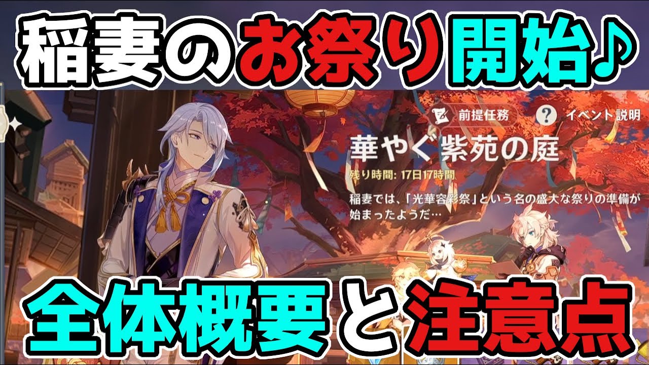 原神げんしん最新バージョンVer2.6/層岩巨淵そうがんきょえんにて、光華容彩祭「稲妻のお祭り」イベント開始!全体概要と注意点についてご紹介した動画になります容彩詩鏡・其の一。旅人の皆さんにガチャで神里綾人(カミサト)ウェンティ神里綾華(かみさとあやか)夜蘭(イェラン)久岐忍(くきしのぶ)雷電将軍と珊瑚宮心海(サンゴノミヤココミ)と八重神子(やえみこ),申鶴(しんかく),雲菫(うんきん),魈(しょう),甘雨(かんう),鍾離(しょうり),荒瀧一斗(あらたきいっと),ゴロー,アルベド,エウルア,胡桃(フータオ)とタルタリヤとトーマと宵宮(ヨイミヤ)と早柚(サユ)と九条裟羅(サラ)が出ますように。報酬として無料で原石モラ育成素材豪華な宝箱天賦突破素材貴重な宝箱冒険経験値聖遺物稲妻評判経験値などが貰えます。