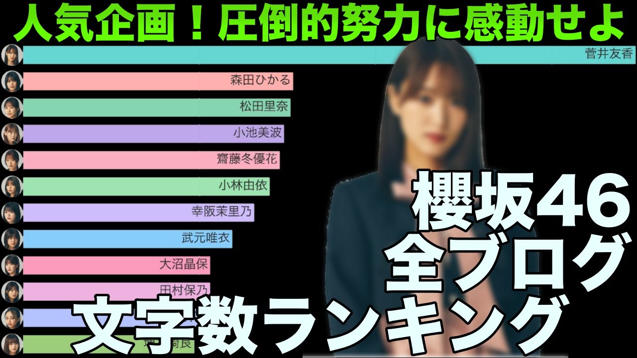 櫻坂46の各メンバーが書いているブログの文字数を合計しランキングにしました。1位の圧倒的努力量には感動するしかありません。これからも櫻坂を引っ張っていってほしいと思いました。