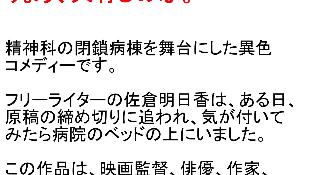 http://amzn.to/2kFX6C1 映画「クワイエットルームにようこそ」主な出演者:内田有紀、宮藤官九郎、妻夫木聡、蒼井優、りょう、大竹しのぶ。精神科の閉鎖病棟を舞台にした異色コメディーです。フリーライターの佐倉明日香は、ある日、原稿の締め切りに追われ、気が付いてみたら病院のベッドの上にいました。この作品は、映画監督、俳優、作家、演出家などで幅広い才能を見せている「松尾スズキ」さんの小説で、2005年の芥川賞候補になっています。 あらすじクワイエットルームにようこそりょう内田有紀大竹しのぶ妻夫木聡宮藤官九郎映画とビデオの感想蒼井優