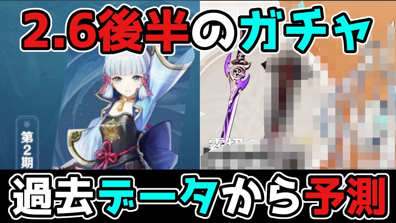 原神げんしん最新バージョンVer2.6/層岩巨淵そうがんきょえんにて、2.6後半のガチャを「過去データ」から予測してみたについてご紹介した動画になります。旅人の皆さんにガチャで神里綾人(カミサト)ウェンティ神里綾華(かみさとあやか)夜蘭(イェラン)久岐忍(くきしのぶ)雷電将軍と珊瑚宮心海(サンゴノミヤココミ)と八重神子(やえみこ),申鶴(しんかく),雲菫(うんきん),魈(しょう),甘雨(かんう),鍾離(しょうり),荒瀧一斗(あらたきいっと),ゴロー,アルベド,エウルア,胡桃(フータオ)とタルタリヤとトーマと宵宮(ヨイミヤ)と早柚(サユ)と九条裟羅(サラ)が出ますように。報酬として無料で原石モラ育成素材豪華な宝箱天賦突破素材貴重な宝箱冒険経験値聖遺物稲妻評判経験値などが貰えます。