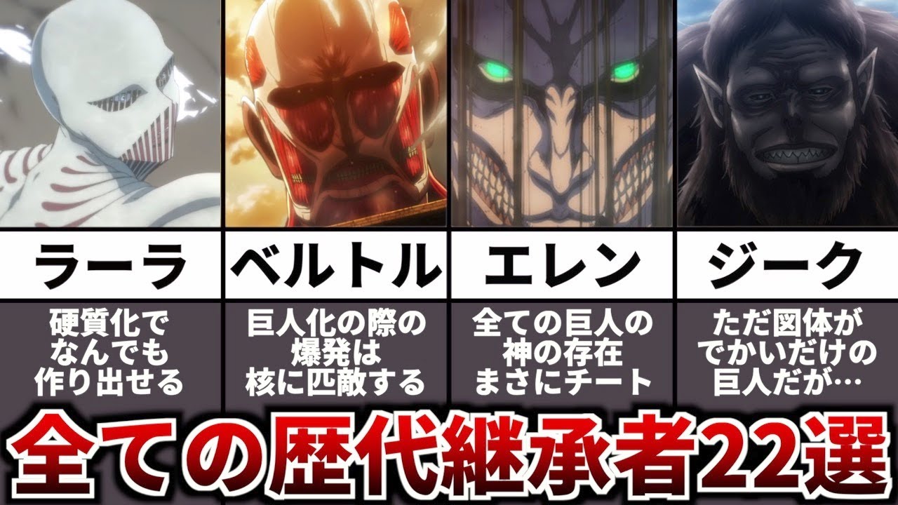 今回は、進撃の巨人に登場する全ての九つの巨人の継承者について紹介していきました。 参考資料&引用 ©諫山創・講談社/「進撃の巨人」The Final Season製作委員会 ※動画内で使用している全ての画像は上記の作品からの引用させていただいております。 #進撃の巨人 #ファイナルシーズン #The Final Season Part2 #考察 The Final Seasonエレンファイナルシーズンライナーリヴァイ巨人考察解説進撃の巨人進撃の巨人 The Final Season Part 2