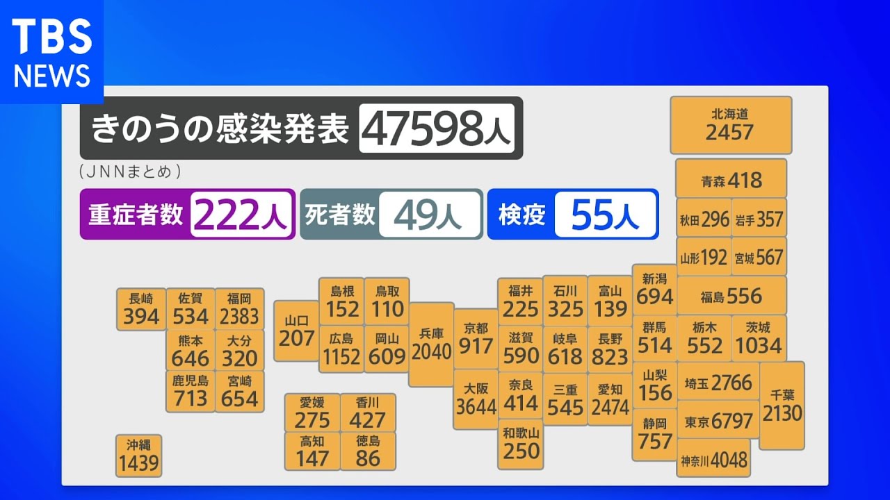 また、全国では新たに4万7598人の感染が発表され、先週土曜日から5000人余り減っています。都道府県別で東京に次いで多いのは▼神奈川で4048人、▼大阪で3644人▼埼玉で2766人などとなっていています。全国で入院している感染者のうち、「重症者」とされる人の数は222人で、新たに49人の死亡が発表されています。(16日21:24)