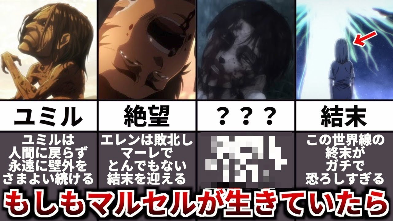 今回は、ユミルがマルセルを食べなかったらどうなっていたのかについて紹介していきました。 参考資料&引用 ©諫山創・講談社/「進撃の巨人」The Final Season製作委員会 ※動画内で使用している全ての画像は上記の作品からの引用させていただいております。 #進撃の巨人 #ファイナルシーズン #The Final Season Part2 #考察 The Final Seasonエレンファイナルシーズンライナーリヴァイ巨人考察解説進撃の巨人進撃の巨人 The Final Season Part 2