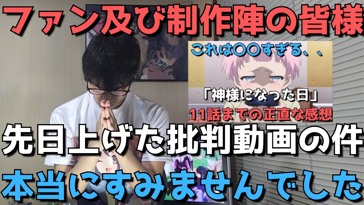 今回は、2020年の秋アニメで先日完結を迎えた『神様になった日』の批判動画に低評価が200以上もついてしまい、厳しいコメントも多くいただきましたので、それに関する謝罪動画を撮らせていただきました。