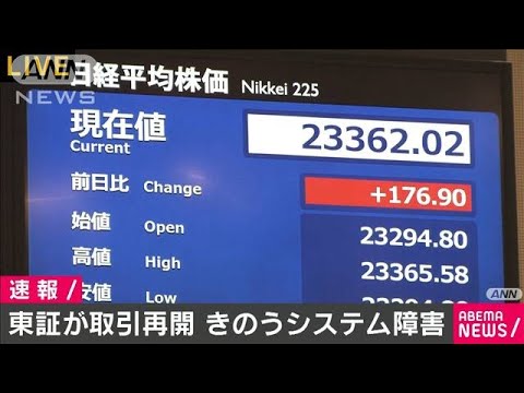 東京証券取引所は1日、メモリーの一部が故障して株価などの情報を配信できなくなったため終日にわたり、取引が停止されました。東証はシステム障害を解消し、2日午前9時から通常通りの取引を再開しました。日経平均株価は1日の終値に先月30日の終値が適用されました。現在は30日の終値に比べて170円ほど値上がりして2万3353円台で取引されています。今月1日の一日で東証が受け付けた売買の注文はすべてキャンセルされ、無効となるということです。東証では1999年に株式の取引がシステム化して以降、すべての売買が停止したのは初めてでした。