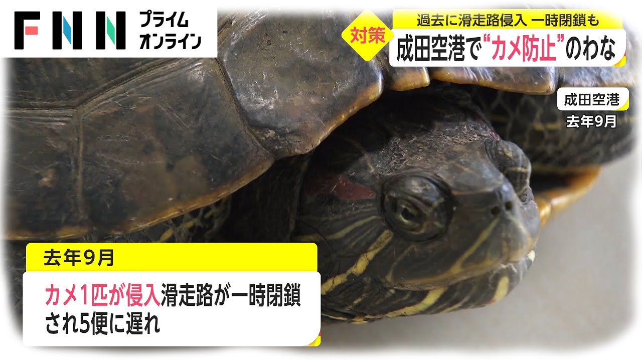 成田空港で、滑走路へのカメの侵入を防ぐため、わなが設置された。 成田空港では2021年9月、カメ1匹が侵入したことで滑走路が一時閉鎖され、5便に遅れが出たことから、20日、侵入防止対策として、滑走路脇の調整池に捕獲用のわなが4つ設置された。空港周辺の池や川には、外来種のアカミミガメが数百匹生息しているとみられている。 FNNプライムオンライン https://www.fnn.jp/ FNNFNNプライムオンラインfujitelevisionNEWSニュースフジテレビフジテレビジョン滑走路