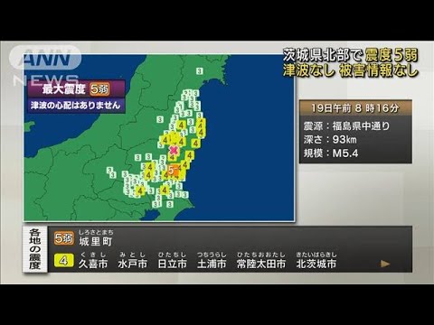 19日午前8時すぎ、茨城県で震度5弱を観測する地震がありました。この地震による津波の心配はありません。