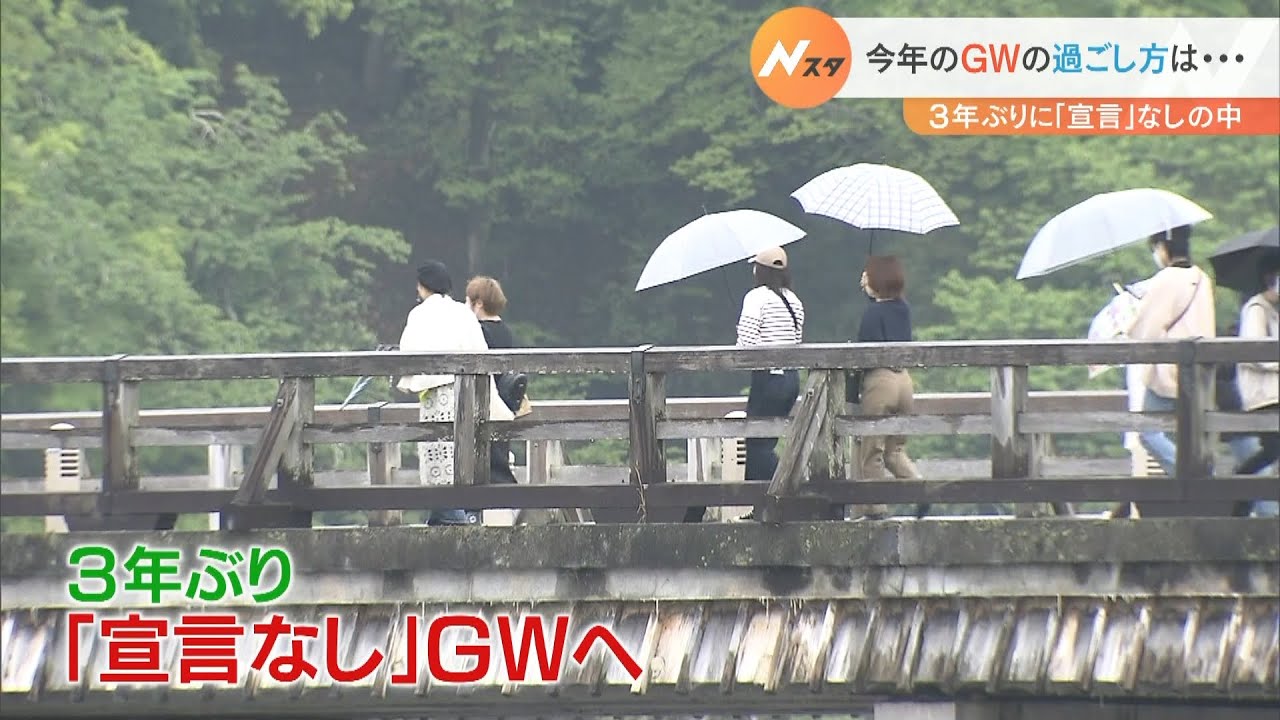 24日の京都・嵐山はあいにくの天気となりましたが、店が立ち並ぶエリアには多くの人の姿がみられました。京都はおととし・去年と2年連続でゴールデンウィーク中に緊急事態宣言が出されていました。今年は新型コロナウイルスの第7波も懸念される中、3年ぶりに「宣言なし」で大型連休を迎えます。嵐山を訪れていた人たちに過ごし方を聞きました。