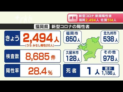 福岡県は21日、新型コロナウイルスの検査で新たに2494人の陽性を発表しました。7日連続で前の週の同じ曜日を下回っていますが2000人を超える日が続いています。
