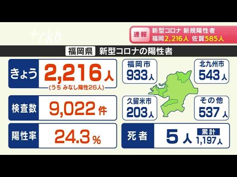 Share Facebook Twitter Pinterest LinkedIn 福岡県は26日、新型コロナウイルスの検査で新たに2216人の陽性を発表しました。 発表自治体ごとの内訳は、福岡市が933人、北九州市が543人、久留米市が203人、そのほかの地域が537人です。県内では80代から90代以上の男女5人が亡くなっています。 25日時点で、専用病床の使用率は28.6%で、前の日を0.3ポイント下回りました。重症病床の使用率は4.3パーセントです。 佐賀県の新規陽性者は585人でした。亡くなった方はいません。大分県と鹿児島県で過去最多となっています。 新型ウイルス検査で陽性