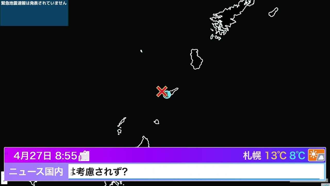 20時53分頃、地震がありました。震源地は奄美大島近海、震源の深さは約30km、地震の規模はM3.7と推定されます。この地震による津波の心配はありません。
