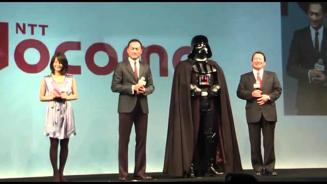 8日に都内で開催されたNTTドコモの新製品発表会に、同社のCMにも登場している堀北真希と渡辺謙、そしてダースベイダーが登場した。